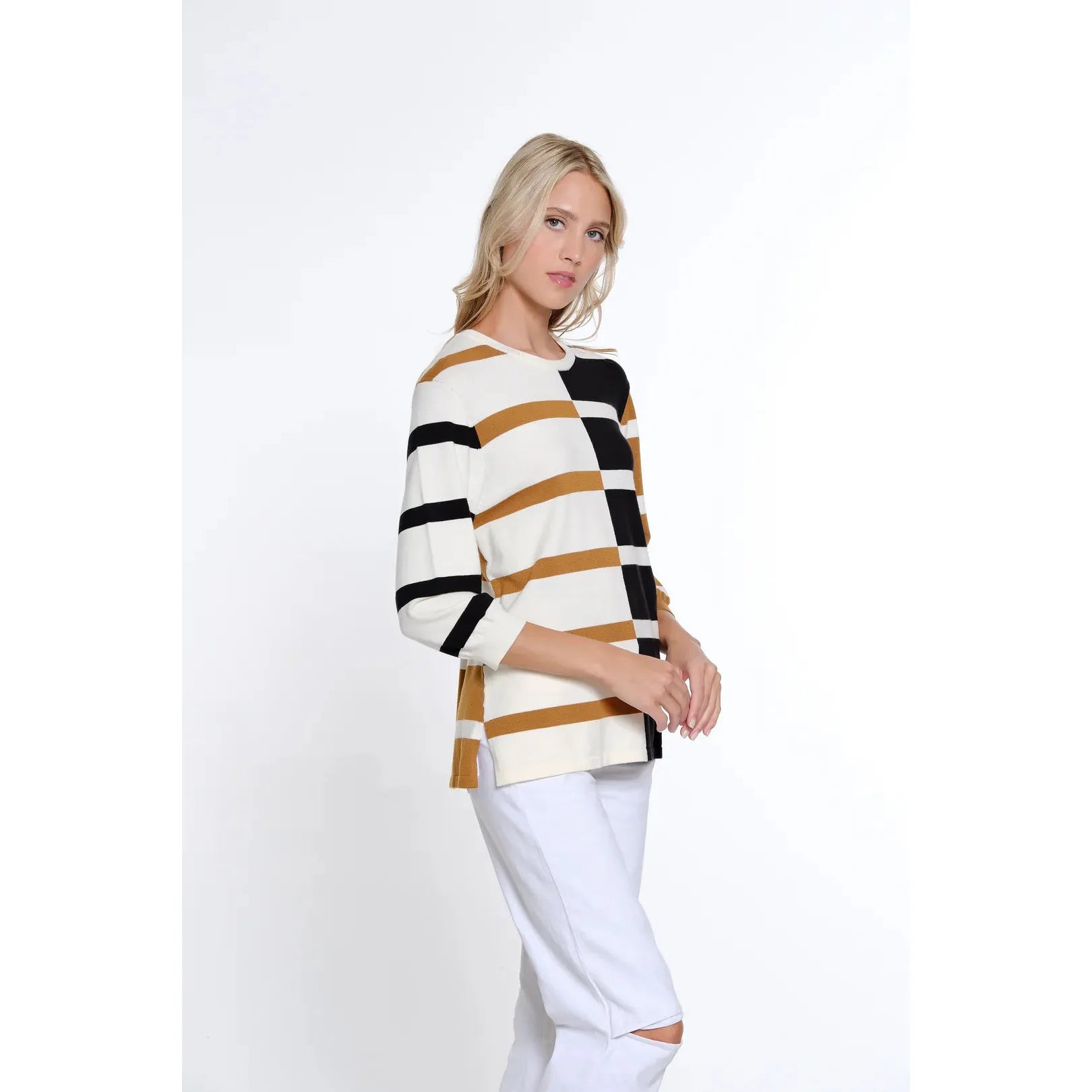 This 3/4 sleeve sweater knit top from Multiples is the perfect blend of classic stripes and modern design. Featuring a jewel neckline and side seam vents, it offers both comfort and style. The soft rayon/nylon fabric ensures a cozy fit, while the stylish vents add a contemporary touch, making this piece ideal for layering or wearing solo for a chic, casual look.