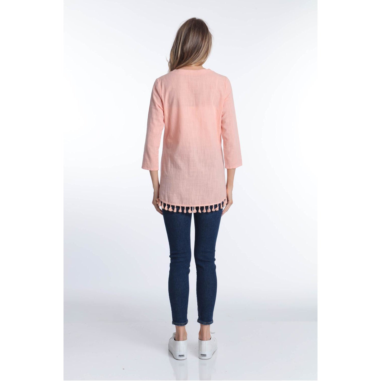 LIGHT WEIGHT, THREE QUARTER SLEEVE TOP V NECK STYLETASSLES AROUND THE HEM